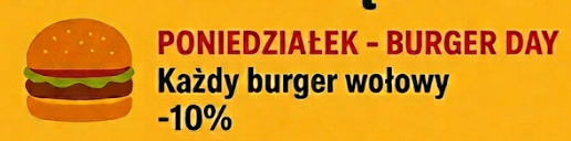 Poniedziałek – Burger Day (każdy burger wołowy -10%)