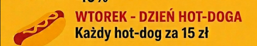 Wtorek – Dzień Hot-Doga (każdy hot-dog 15 zł)